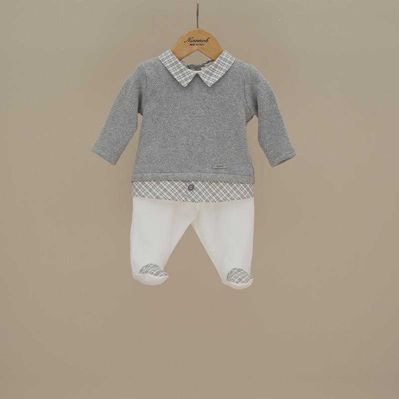 Completo neonato composto da pantalone con piedini in ciniglia e parte superiore con maglionicino e finta camicina. La parte superiore è composta da un maglioncino grigio felpato con colletto a punta e bordo a fantasia quadretti su i toni del grigio. La parte inferiore è composta da un pantalone interno con piedini che richiamano nella parte superiore la fantasia del colletto.Composizione: 80% cotone, 20% poliammide
