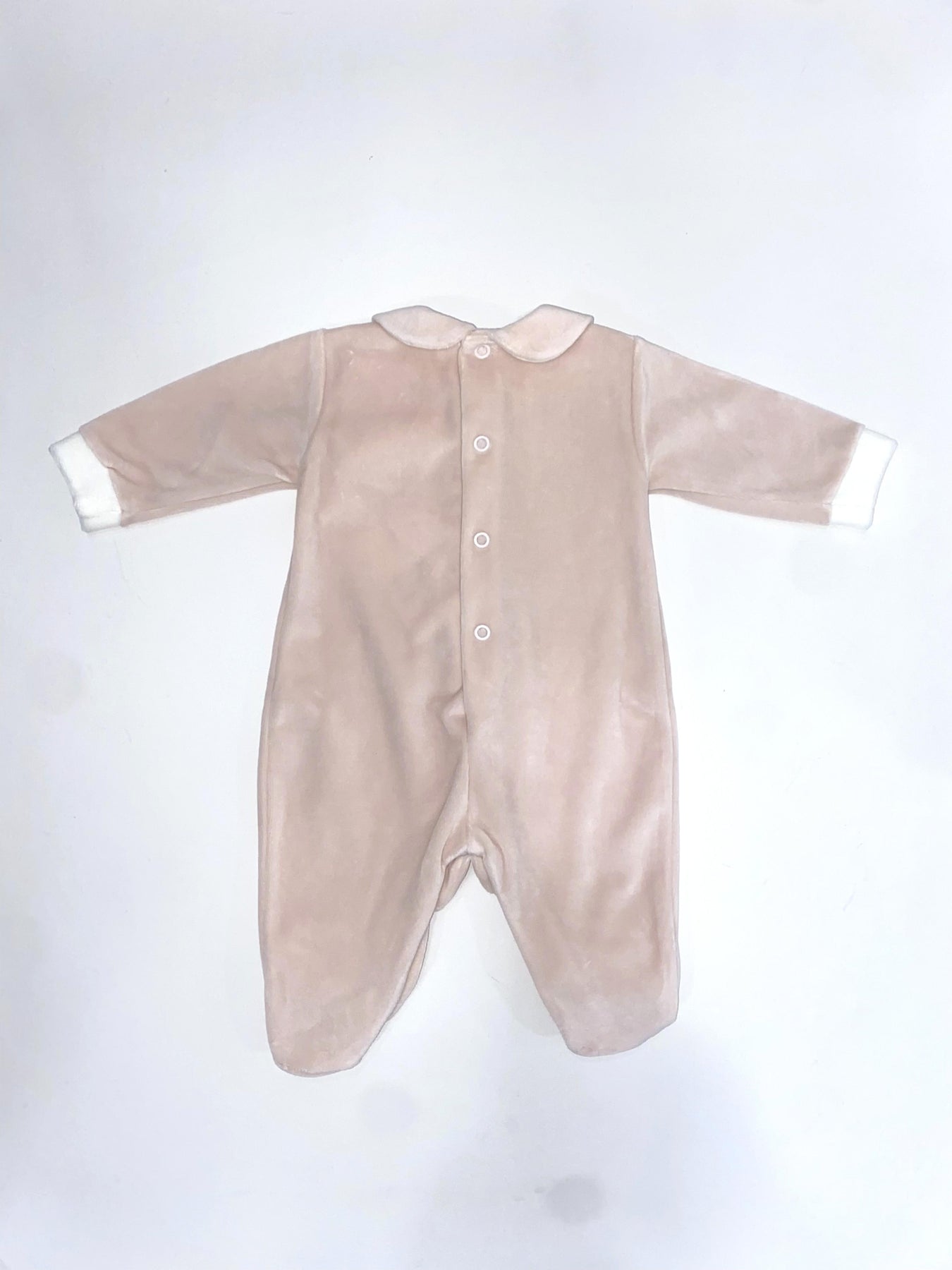 Una graziosa tutina intera in morbida ciniglia color rosa cipria, ideale per avvolgere il bambino in un abbraccio caldo e confortevole. Il design presenta una chiusura con bottoni automatici lungo la parte centrale anteriore per facilitare il cambio. Un elemento distintivo è il bavaglino fisso in tessuto bianco, delicatamente arricchito da un bordo smerlato e ricamato a mano con piccoli fiorellini, che aggiunge un tocco di eleganza. I piedini integrati e i risvolti dei polsini a contrasto completano il capo, rendendolo perfetto per le prime uscite o per un riposo sereno.Composizione: 80% cotone 20% poliestere