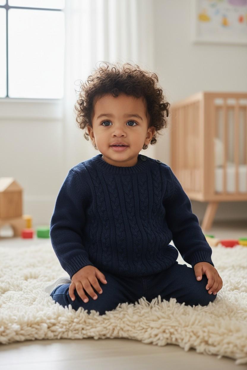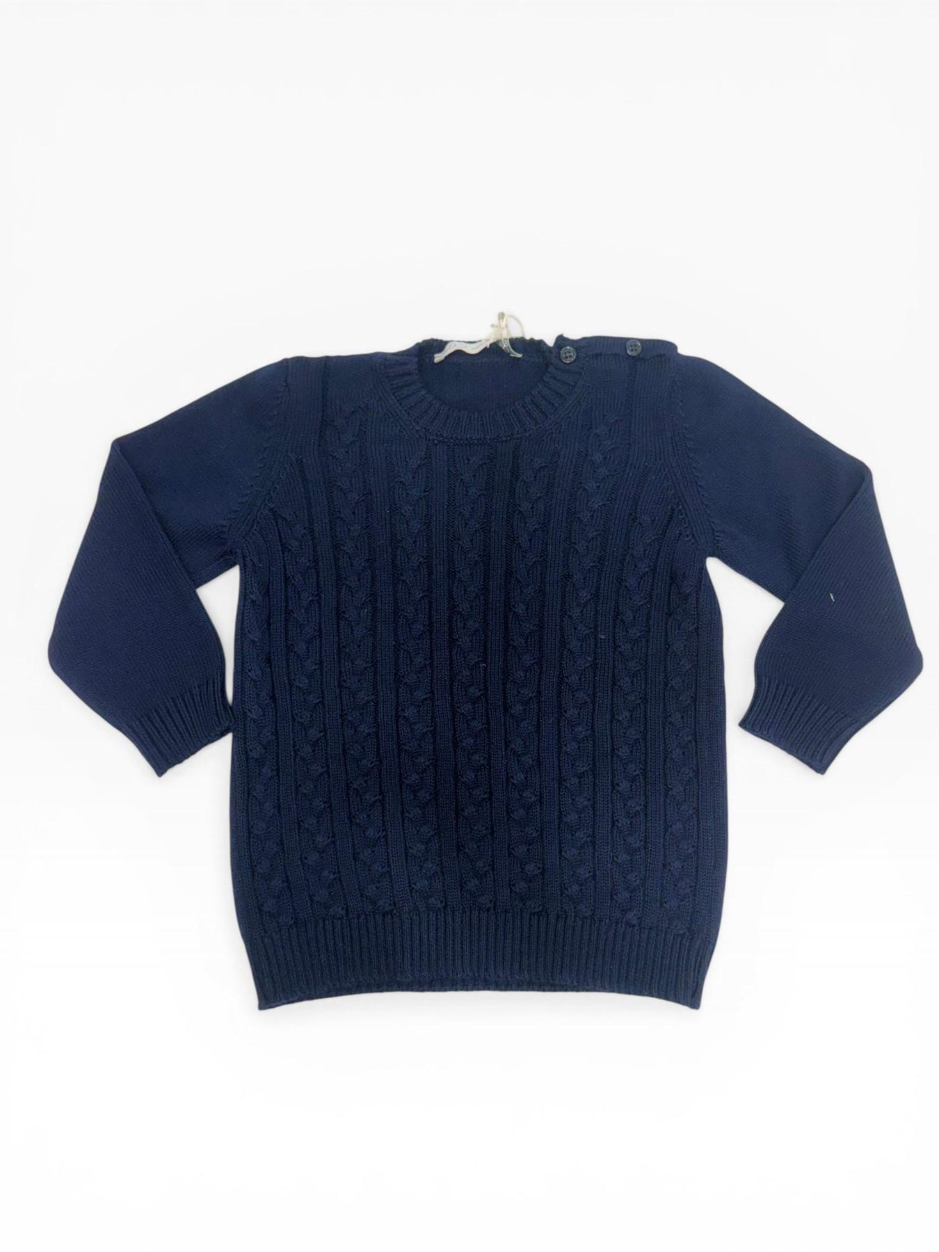 Questo classico maglione girocollo per neonato è realizzato in una morbida e calda maglia color blu navy. Presenta un raffinato motivo a trecce all-over sul davanti che dona un tocco tradizionale e testurizzato al capo. Le maniche lunghe, il collo e il bordo inferiore sono rifiniti con un elastico a costine per una vestibilità confortevole e per mantenere il calore. Una pratica apertura con due bottoni sulla spalla sinistra facilita la vestizione e il cambio. 100% cotone